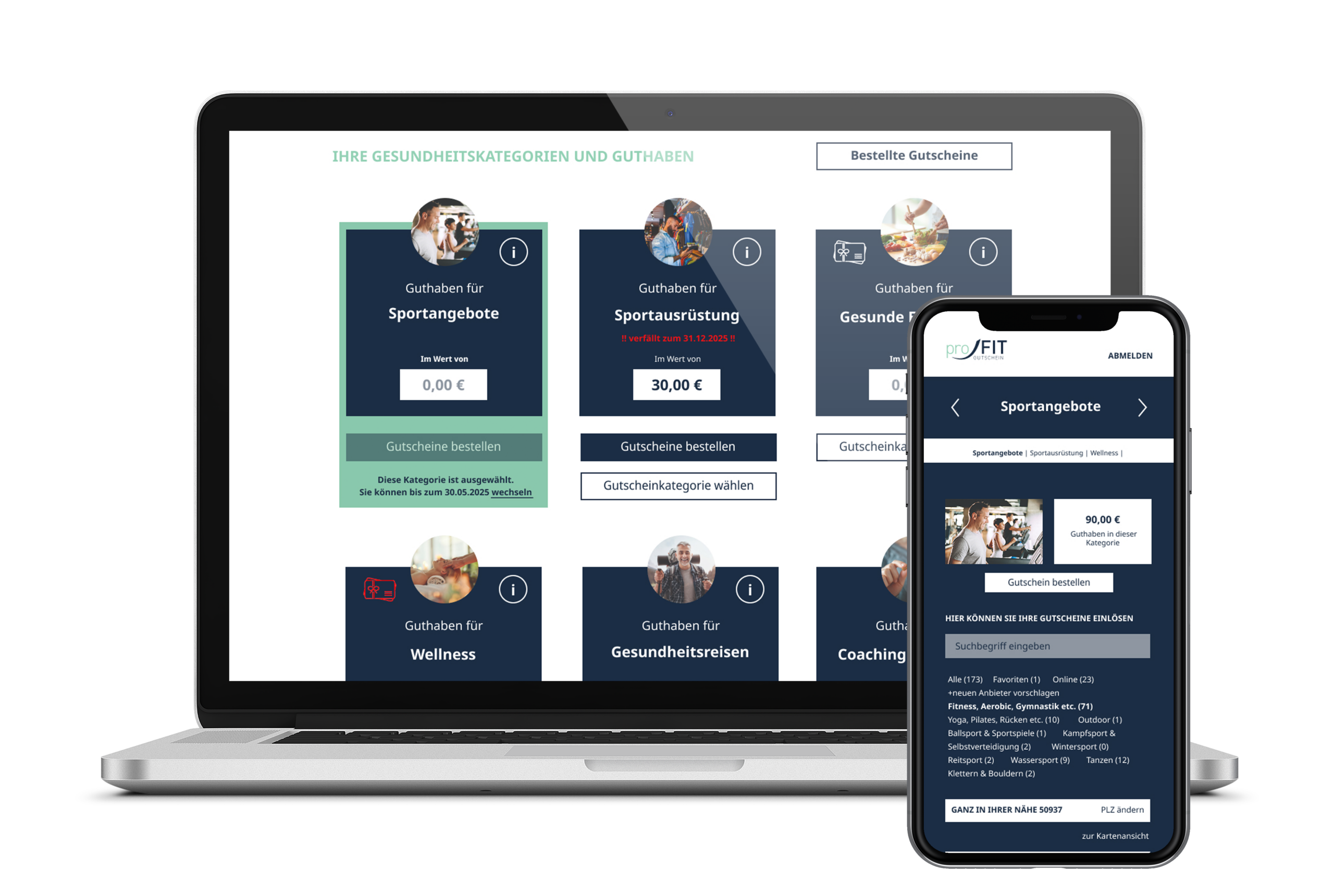 Auf dem Portal wählen die Mitarbeitenden bewusst einen proFIT-Gesundheitsgutschein aus – z. B. Sport, Gesundheitsreisen, Wellness oder Ernährung.
